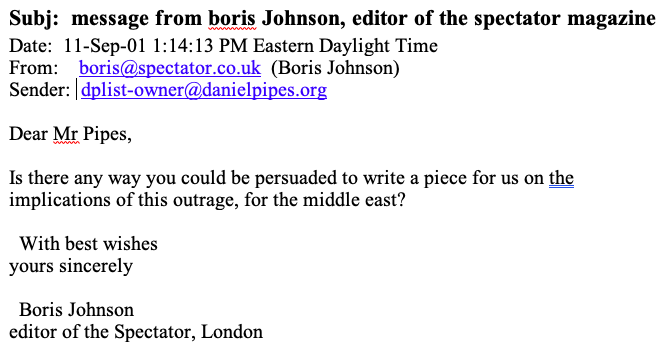 Well, that's a complete surprise. Look who wrote me on 9/11, commissioning an article for the @Spectator; it's then-editor and now-UK prime minister, @BorisJohnson. For reasons I can't recall, my article came out not there but in the @DailyTelegraph. http://www.danielpipes.org/66/protecting-muslims-while-rooting-out-islamists …pic.twitter.com/Pj0m59Fuei