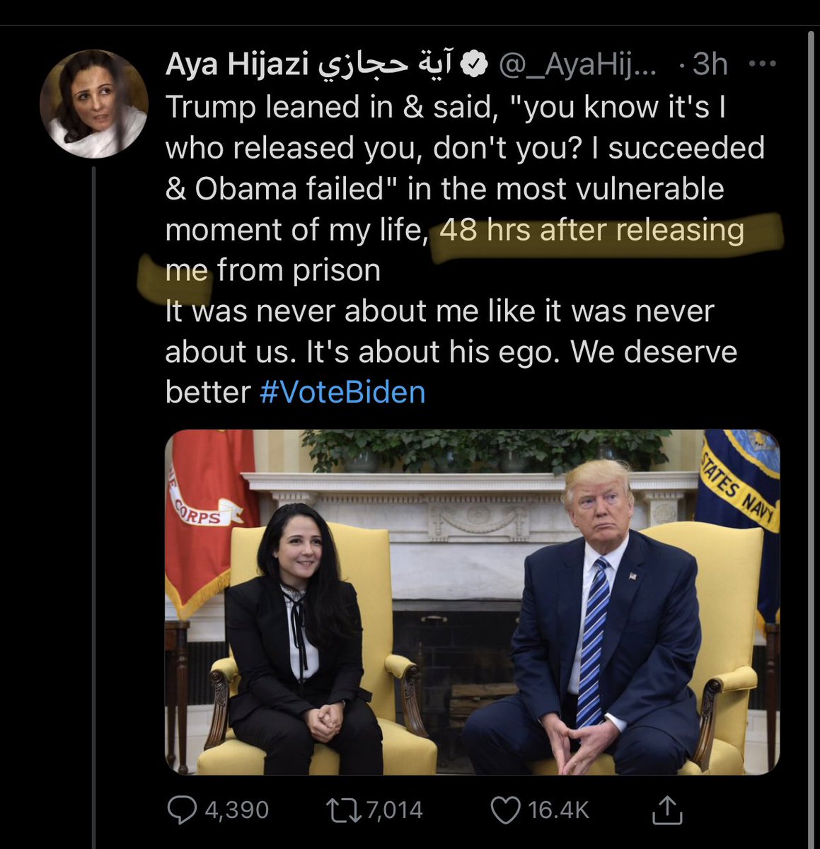 Trump leaned in & said, "you know it's I who released you, don't you? I succeeded & Obama failed" in the most vulnerable moment of my life, 48 hrs after releasing me from prison It was never about me like it was never about us. It's about his ego. We deserve better #VoteBidenpic.twitter.com/SMhaAHKfWi