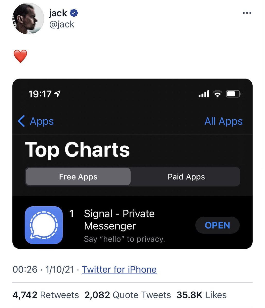 musk tweeted “use Singal” the other day too. That likely caused some of the move up to #1 as well. (It also caused an unrelated pennystock to rise 700% by confused robinhood traders, that’s where we are).