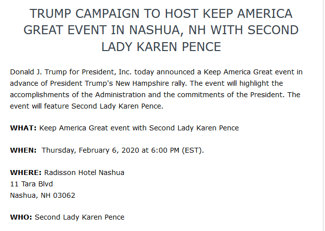 @realDonaldTrump campaign announced that Second Lady@KarenPence will headline a campaign event 2/6 at the Radisson Hotel, Nashua.#fitn#nhpolitics#WMURpic.twitter.com/BRWxadzP5P