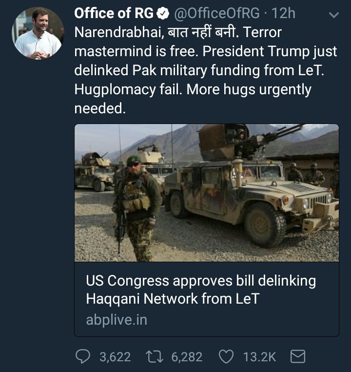 Narendra bhai se kaam nahi ban raha, RahulJi aap ek baar desh k liye Trump k sath hugplomacy try kiw nahi karte?pic.twitter.com/fqX3lcku4n