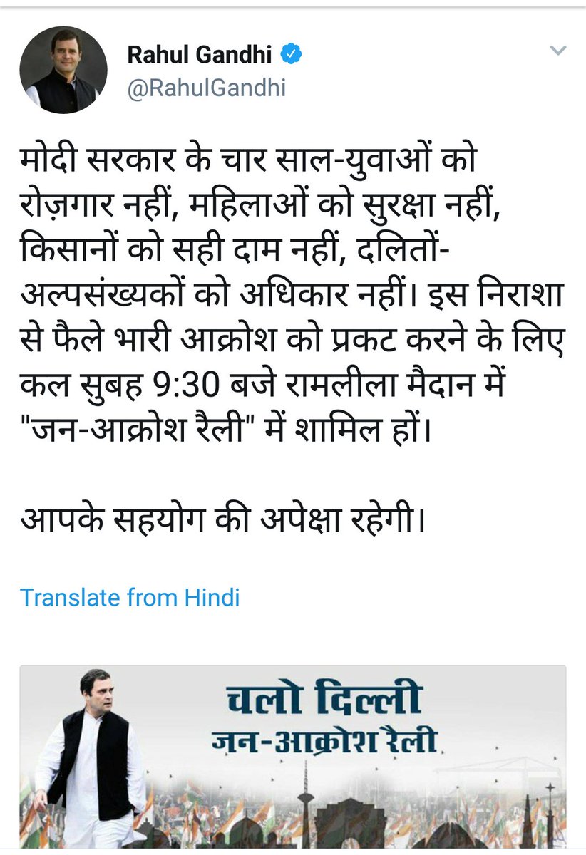 मोदी सरकार के चार साल-युवाओं को रोज़गार नहीं, महिलाओं को सुरक्षा नहीं, किसानों को सही दाम नहीं, दलितों-अल्पसंख्यकों को अधिकार नहीं। इस निराशा से फैले भारी आक्रोश को प्रकट करने के लिए कल सुबह 9:30 बजे रामलीला मैदान में "जन-आक्रोश रैली" में शामिल हों। आपके सहयोग की अपेक्षा रहेगी।pic.twitter.com/a9kYO72s0r
