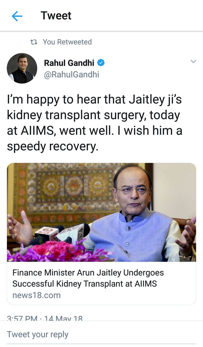 I Congratulate @arunjaitley for his successful surgery and wish him speedy recovery