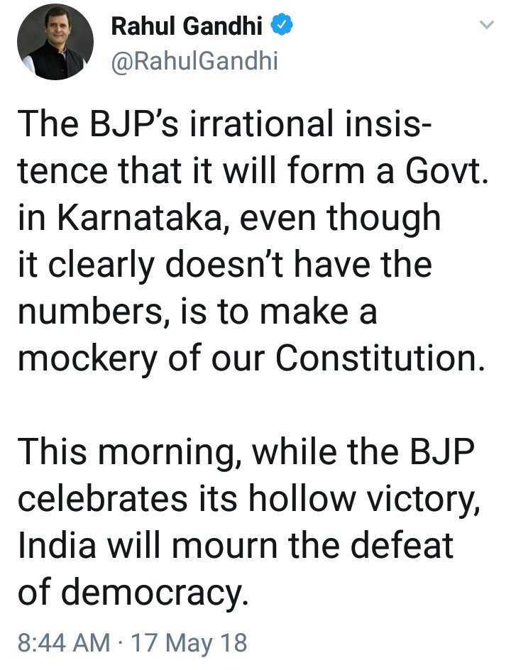 @BJP4India दिया! 2. काँग्रेस को जनता ने नकारते हुए पहले से आधी सीटों पर ला पटका! 4. अब हारी हुई@INCIndia दूसरी हारी हुई#JDS से मिलकर कह रही है हमारे पास बहुमत है! इस बहुमत में जनता का लोकतंत्र कहाँ है?लोकतंत्र जनता का या पार्टियों का?pic.twitter.com/0nSvbna9ntThis media may contain sensitive material. Learn more