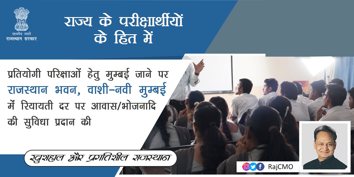 मुख्यमंत्री श्री अशोक गहलोत ने प्रदेश के परीक्षार्थियों के हित को ध्यान में रखते हुए महत्वपूर्ण निर्णय लिया। प्रतियोगी परिक्षाओं हेतु मुम्बई जाने पर राजस्थान भवन, वाशी-नवीं मुम्बई में रियायती दर पर आवास/भोजनादि की सुविधा प्रदान की