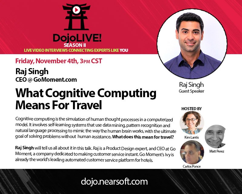 @dojolive: Raj Singh, CEO @ GoMoment - "What Cognitive Computing Means to Travel" http://dojo.nearsoft.com@RajSinghLApic.twitter.com/L4wsMqBD6V