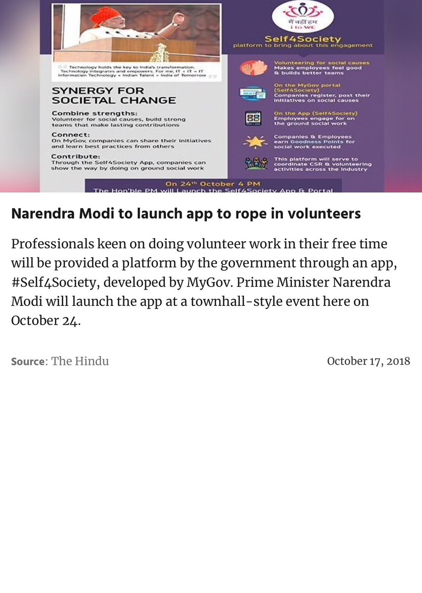 Hon’ble Prime Minister @narendramodi ji set to launch the #Self4Society App to promote effective volunteering by working professionals and companies for social causes. Developed by @mygovindia