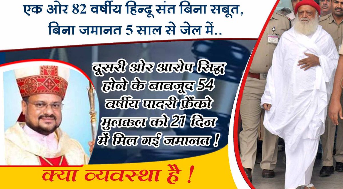 क्या हिन्दू Sant Shri Asaram Bapu Ji को केवल आरोप के आधार पर आजीवन कारावास देना और बलात्कारी पादरी फ्रैंको मुलक्कल पर भी आरोप लगने पर बेल देना न्याय है ? #DualityInLegalSystempic.twitter.com/NbIkwj39ls