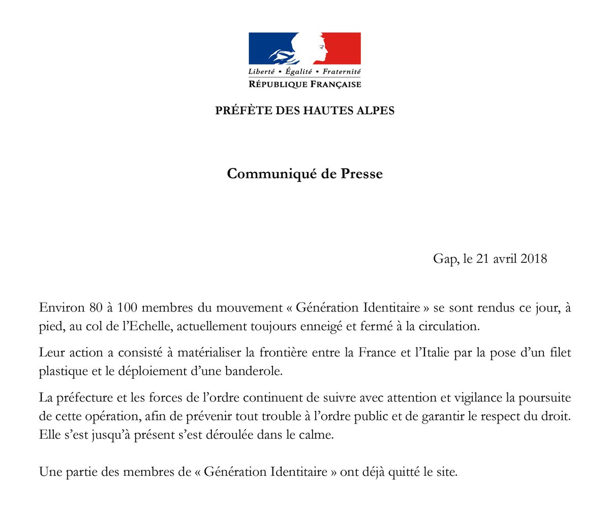 L’Etat ne doit pas laisser un groupuscule faire la police aux frontières de la France ! Le communiqué de la préfète est scandaleusement ambigüehttps://twitter.com/prefet05/status/987772043918749696 …