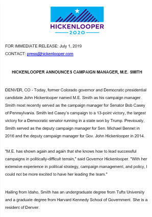All in one night: @hickenlooper's campaign announced M.E. Smith as the new campaign manager, replacing Brad Komar. Spokeswoman Lauren Hitt confirmed National Finance Director Dan Sorenson is joining @BetoORourke's campaign -- Hitt is also leaving. Sources say they were not firedpic.twitter.com/WJKTazWYOr