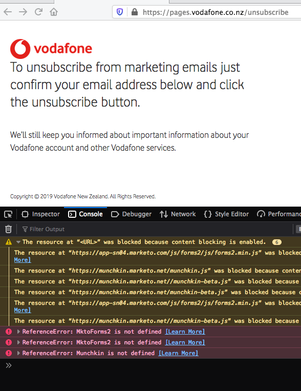 @vodafoneNZ, I'm tired of your company doing crap like this. Don't spam me & *then* require me 2 enable web tracking in order 2 unsubscribe. Other companies manage 2 make 1-click unsub work, I'm sure yr developers can too--when yr biz folks don't stop them. cc:@nzcomcompic.twitter.com/JbQv4RVNpS