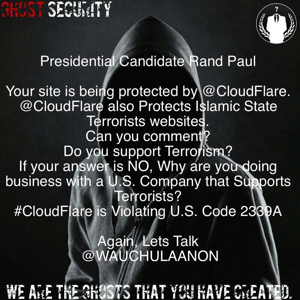 @RandPaul What do You, Islamic State Terrorists and Cloudflare have in common? #GhostSec #Anonymouspic.twitter.com/oMqgInhOIJ