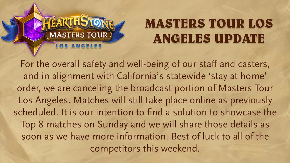 🚨Por cuarentena en Los Angeles no habrá trasmisión mañana del #MastersTourLosAngeles de @PlayHSLATAM ➡️El torneo se desarrollará sin trasmisión por lo cual les recomendamos que sigan a @TierrasFuegoHS para enterarse todos los resultados de la #LegionLatampic.twitter.com/Il0Lif7RZs