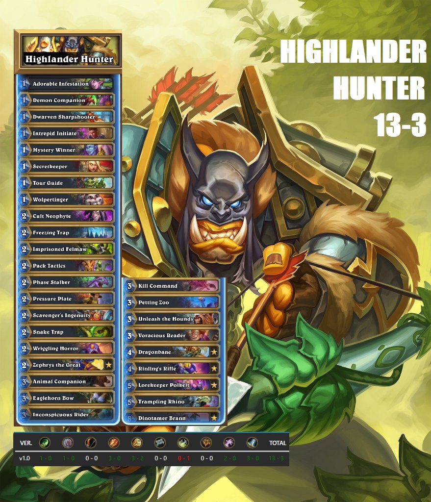 Decided to check out the top Highlander Hunter list on HSreplay and just did a cool 13-3 to do the final push to Legend. Deck seems to go under a lot of stuff right now so maybe Hunter has some life left in it?pic.twitter.com/3PpnCkryg5