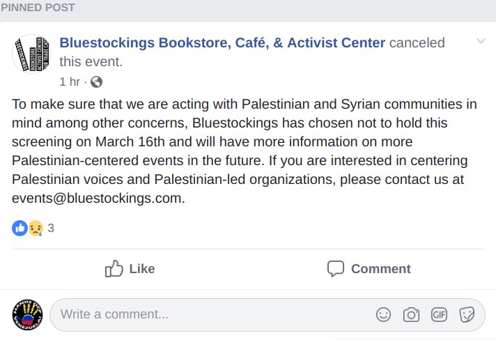 So @bluestockings claims to be canceling a screening of a Gaza documentary to support those in the Palestinian and Syrian communities who dislike @MaxBlumenthal. Who speaks for these communitie? Apparently only those who want war on Syria, the rest of our voices don’t matter.