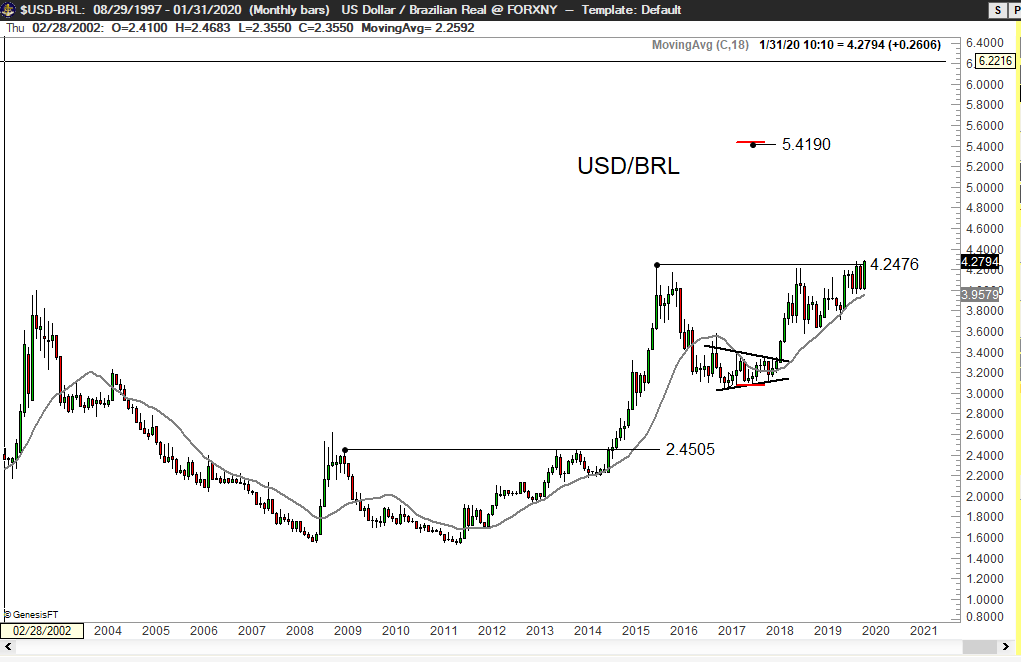 But what could be just an Asian regional weakness takes on more important signal effects when the Brazilian Real is about the break a gigantic cup and handle. You see, Brazil loses on the US/China trade deal and loses again as Chinese demand collapses for commodities...pic.twitter.com/z2CLP9a7mS