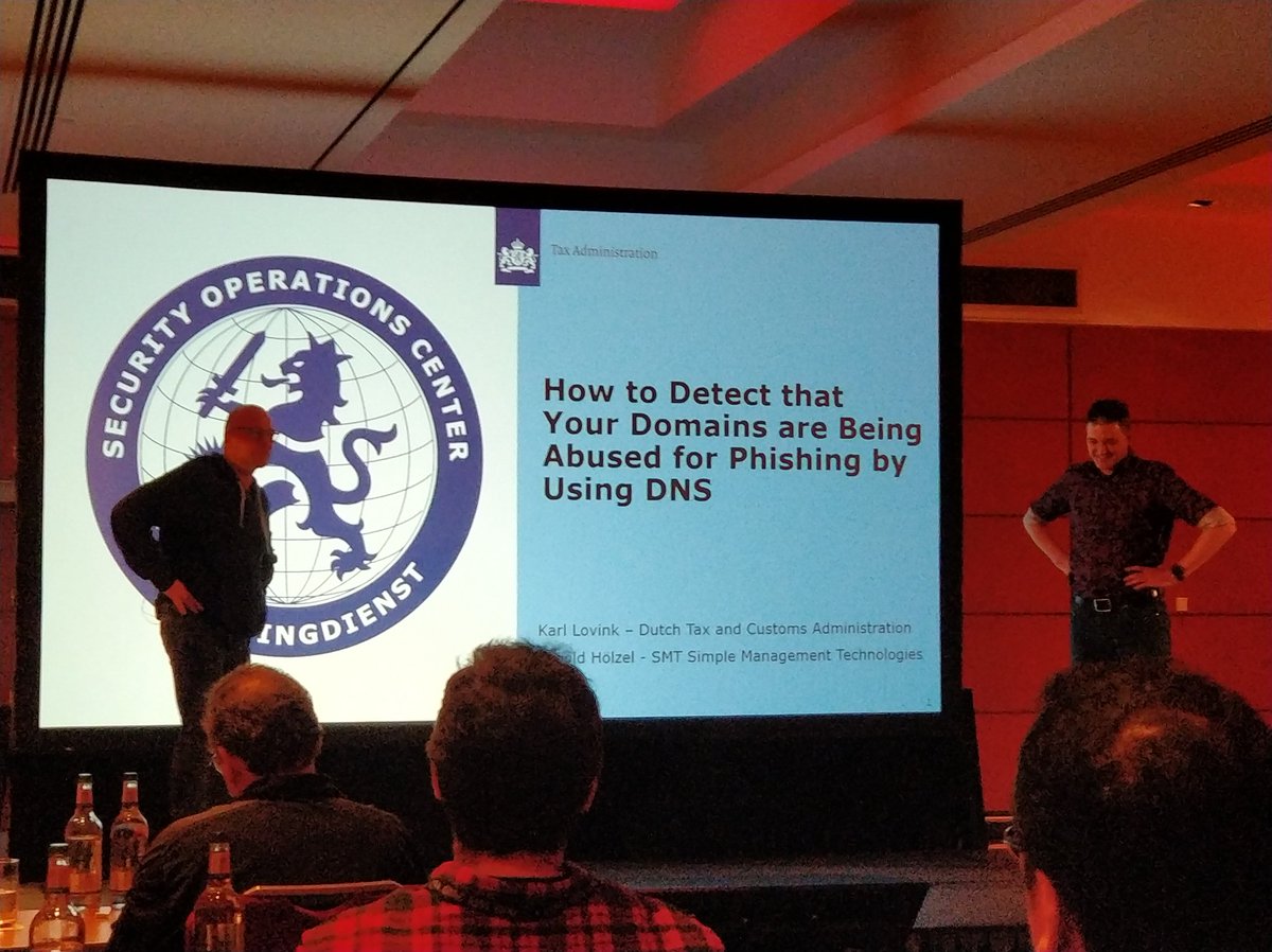 Talk on "detecting if your domains are used for phishing", speakers say that despite having 550 domains they were able to have standards like SPF and DMARC rolled out in a month, and see where emails come from and get a lot more insight.