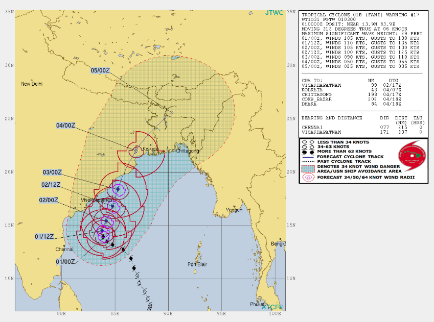 #CycloneAlert: Extremely Severe #CycloneFani intensifying further and heading towards Northern #Odisha. People live in the coastal areas of #Odisha & #WestBengal be alert & prepared. We are monitoring the situation and preparing for response. #fani #fanicyclone #Kolkata #Puripic.twitter.com/JIS9DJrJy5