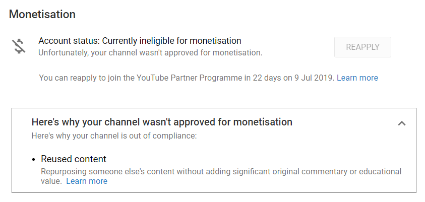 @TeamYouTube I was denied monetisation for "re-used content" I understand this if I was re-uploading someone else's video, but that's not the case. These videos are uploaded with permission from submitters & take time to edit, this is stated as an exception in your guidelines.pic.twitter.com/mtbFsdMwM2
