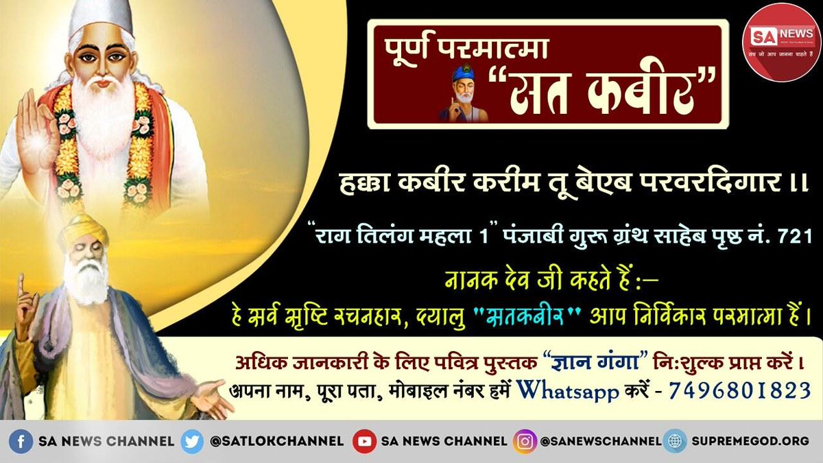 #FridayThoughts पूर्ण परमात्मा "सत कबीर" हैं। हक्का कबीर करीम तू बेएब परवरदिगार।। ‘‘राग तिलंग महला 1‘‘ पंजाबी गुरु ग्रन्थ साहेब पृष्ठ नं. 721 नानक देव जी कहते हैं:- हे सर्व सृष्टि रचनहार, दयालु ‘‘सतकबीर‘‘ आप निर्विकार परमात्मा हैं। अधिक जानकारी के लिए देखिए साधना टीवी 7:30pmpic.twitter.com/I8SMFNnm9y