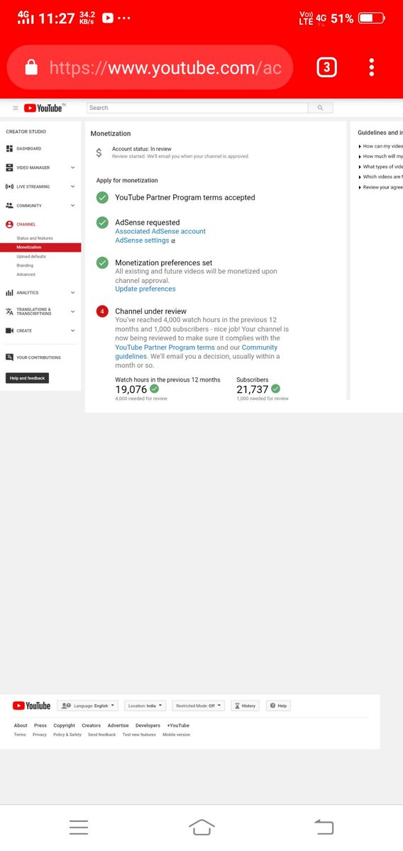 Hello@TeamYouTube my channel is completed 4k+hours watch time & 1k+subscribers is previous 12 months and still my channel monetization is not enabled plz guide us. Channel link -https://www.youtube.com/channel/UCObC04rY62w-ldVfUWvvnRA … Thank you.pic.twitter.com/CGXj1NqCKn