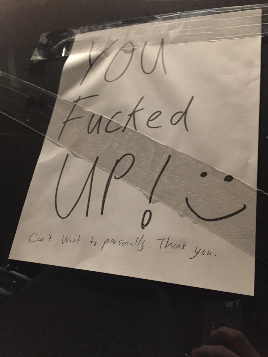 Taped onto my car monkaS. Some angry Ex got the wrong car I’m p sure no one hates me this much