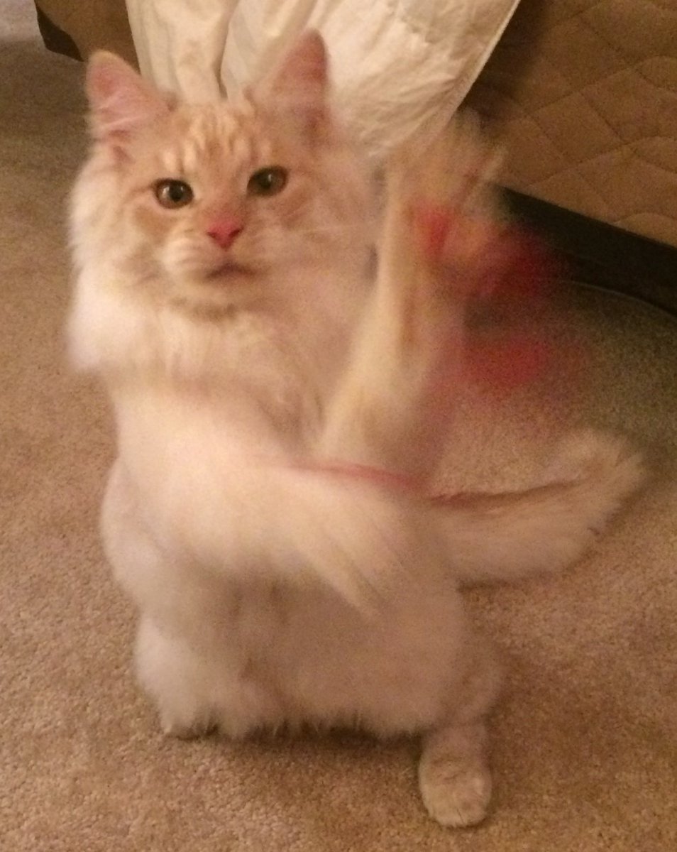 Okay so Kaiser is so sweet, chill, the softest cat I've ever met, and incredibly handsome. He loves to murder feather toys, and he keeps climbing in my lap for belly rubs and purrs.