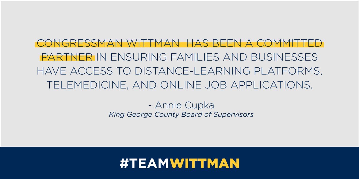 Thank you Annie Cupka - King George Board of Supervisors - for your support of my work on broadband! “Congressman Wittman has been a committed partner in ensuring families and businesses have access to distance-learning platforms, telemedicine, and online job applications.”pic.twitter.com/7If7HIwI3I