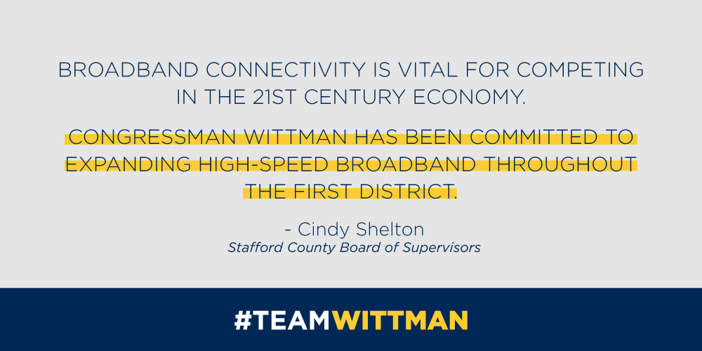 Cindy Shelton - Stafford County Board of Supervisors - has voiced her support of my efforts to expand broadband in the First District. Thank you Cindy! “Congressman Wittman has been committed to expanding high-speed broadband throughout the First District.”pic.twitter.com/Tj2dvfZV04