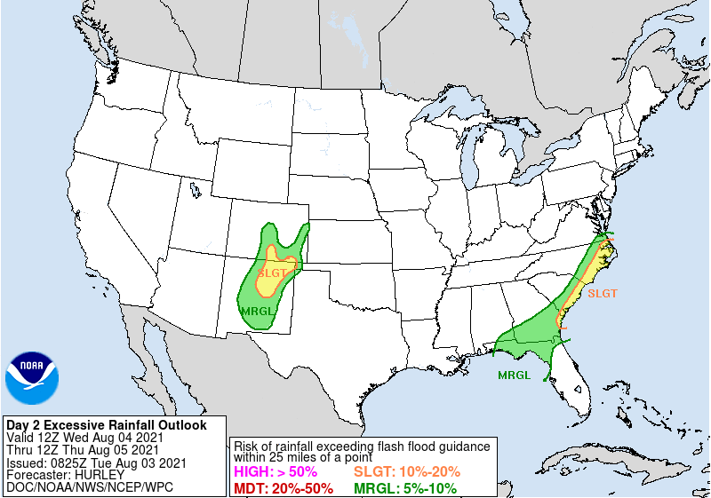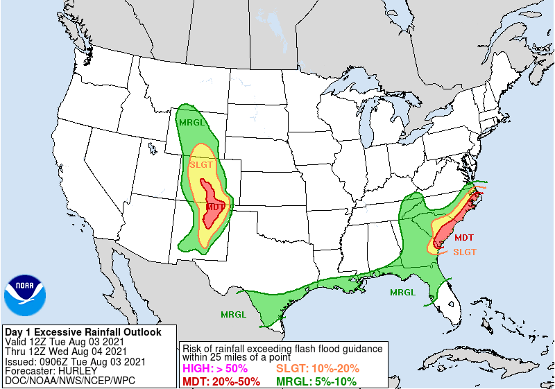 Heavy rain will contribute to flash and small stream flooding threats in southern New England Thursday and across portions of coastal NC, VA and FL through Friday. Excessive heat will continue to impact the southern CA mountains and deserts into AZ and NV Thursday.pic.twitter.com/UGtZE7eFiP