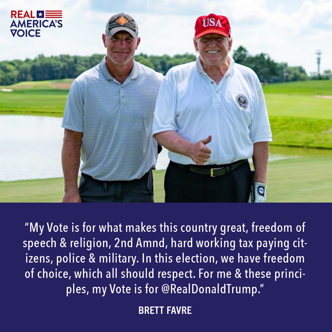 Today, NFL legend Brett Favre endorsed President Donald Trump for re-election. For more on this story, watch @RealAVNews on PlutoTV 240, Dish 219, Roku or http://AmericasVoice.news .pic.twitter.com/t5YvSBxNJ1