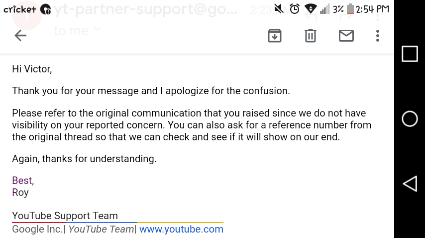Hello @TeamYouTube I decided to send my reported issue about my channel being hacked over on gmail, but I have been told that I need a reference number to further the investigation. The original conversation is here so I'm not sure if you guys can help out? Thanks!pic.twitter.com/4j4NfbelZn