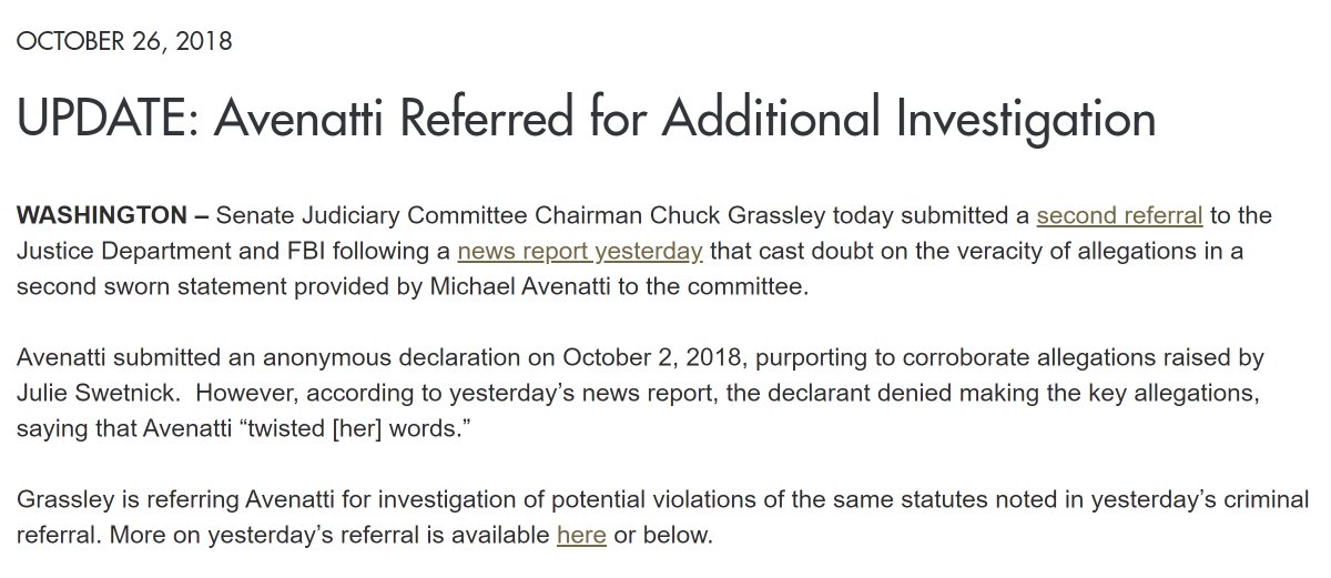 @RealSaavedra: BREAKING: The Senate Judiciary Committee has sent a second criminal referral to DOJ for Michael Avenatti regarding another declaration he submitted to the committee about Brett Kavanaugh. http://judiciary.senate.gov/imo/media/doc/2018-10-26%20CEG%20to%20DOJ%20FBI%20(Second%20Avenatti%20Referral)%20-%20with%20enclosures_Redacted.pdf …pic.twitter.com/a3llOvGHLV