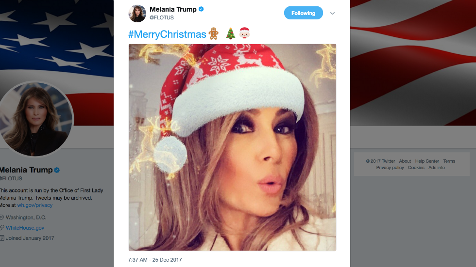 Melania Trump tweets Christmas selfie with holiday-themed filter complete with reindeer and Santa hat http://hill.cm/koLbFjV  pic.twitter.com/SeFqrCXTuW