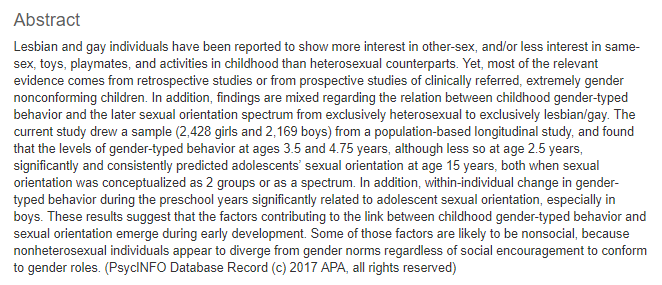 Lesbian women and gay men show gender atypical interests already in early childhood https://psycnet.apa.org/record/2017-07850-001 …