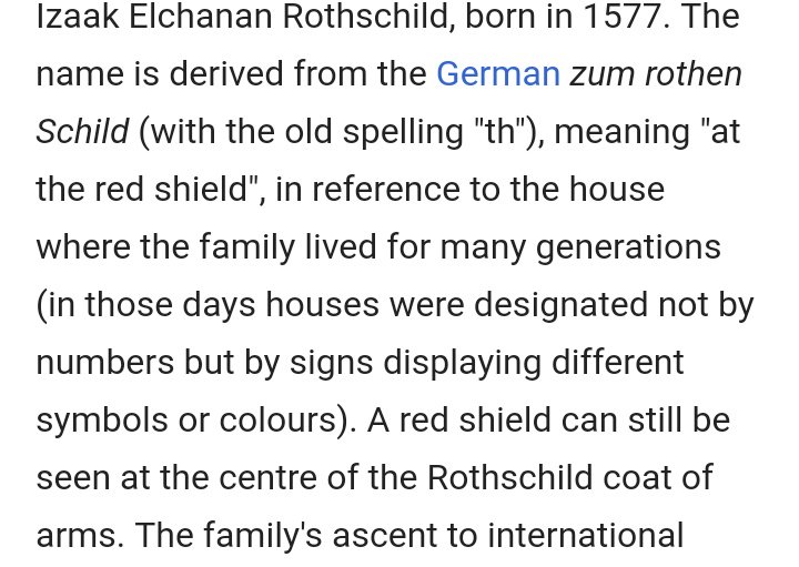 https://en.m.wikipedia.org/wiki/Rothschild_family … the etymology is shield and they literally have a red shield on their coat of arms . That word could have different meanings tho, im not gonna argue that.