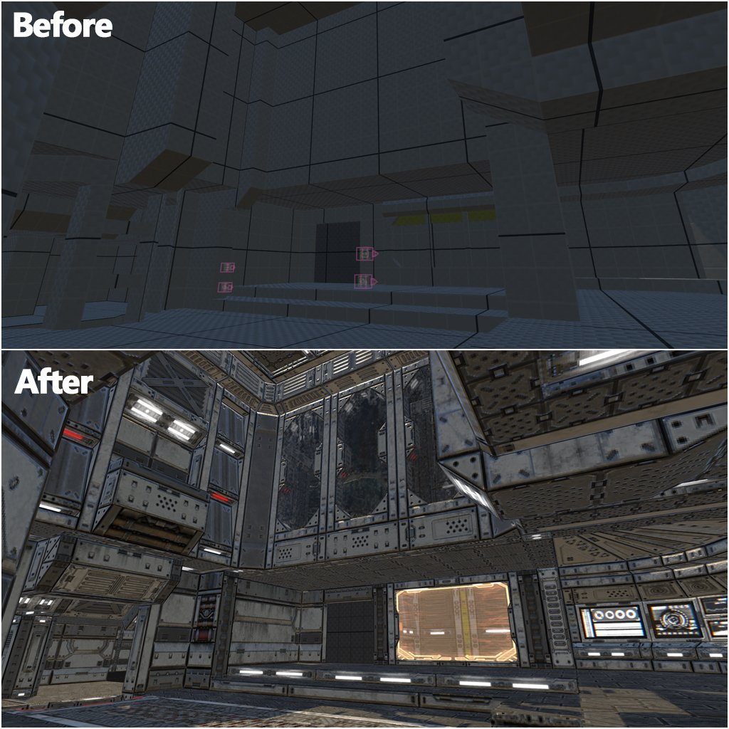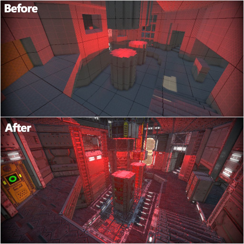 #6 More comparison shots, one of the main splitter rooms with moving actuators! Finally got a 1st art pass done! No lighting pass just yet.