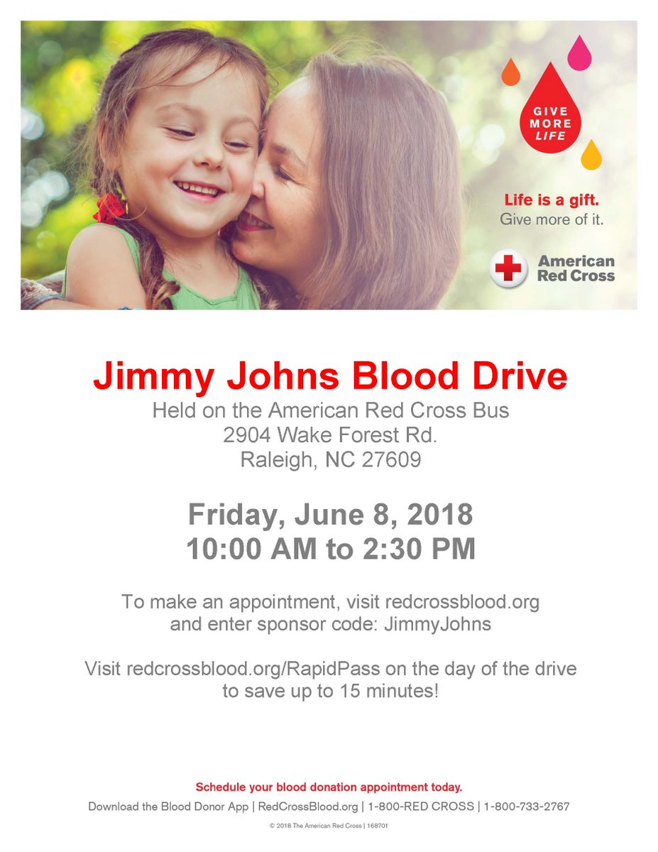 Life is a gift - give more of it! Join us at the @jimmyjohns Blood Drive (2904 Wake Forest Rd., Raleigh) on Friday, June 8, from 10 a.m. to 2:30 p.m. To make an appointment, visit http://redcrossblood.org  and enter sponsor code: JimmyJohnspic.twitter.com/75rqzjSJzA