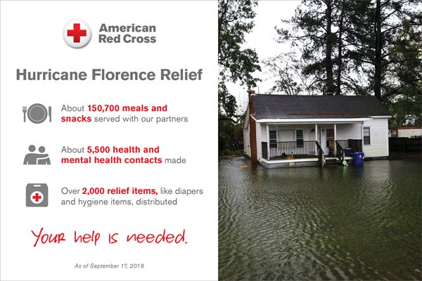 The threat from #hurricaneflorence is far from over, as extremely dangerous flooding continues. @RedCross is working around the clock to provide safe shelter and comfort to all who need it.pic.twitter.com/jX4p1xQ1Ts