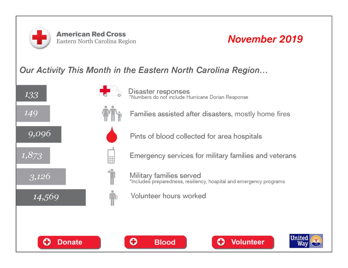 The Red Cross team worked around the clock to serve 53 counties in Eastern NC in November. Behind these numbers are families that received comfort and hope from your Red Cross. #LiveUnitedpic.twitter.com/rlFanfy9Iw