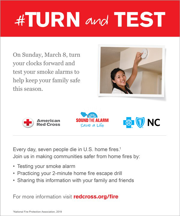 Red Cross and @BlueCrossNC want to remind you it’s time to turn your clocks forward one hour when daylight saving time starts on Sunday, March 8. When you TURN your clocks forward, also TEST your smoke alarms. #EndHomeFirespic.twitter.com/VYmGWM3fU2
