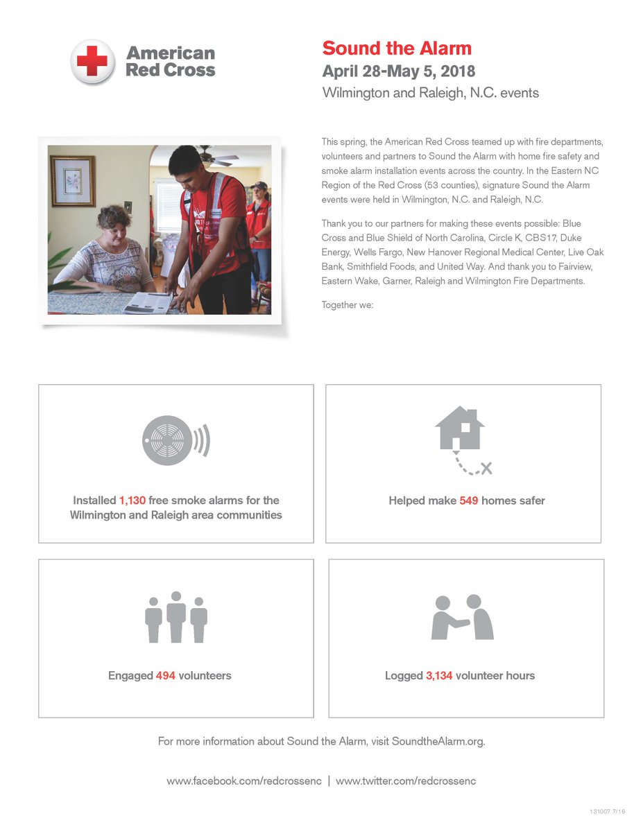 In the Eastern NC Region of the Red Cross, signature Sound the Alarm events were held in #Wilmington, N.C. and #Raleigh, N.C. Together, we installed 1,130 smoke alarms! #EndHomeFirespic.twitter.com/rZw9RMZDlc