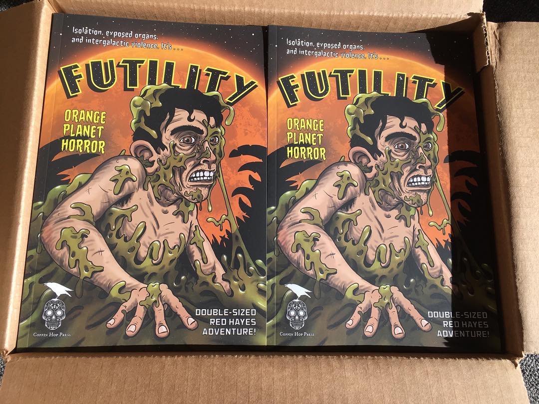 With the help of our new unholy allies, Coffin Hop Press, our new fullsize graphic novel, Futility: Orange Planet Horror arrives next week! Among many elements we’re proud of,