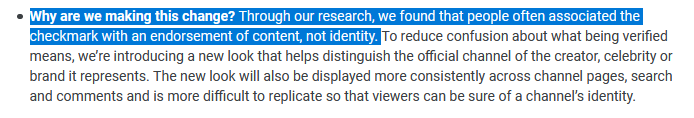 It should be easy to know when you’ve found the official YouTube channel of a creator, artist, brand, or public figure. So in late October, we’re updating what it means for channels to be “Verified” w/ new eligibility criteria & a new look. Details → https://yt.be/help/3QfB pic.twitter.com/JXOvMbkbns