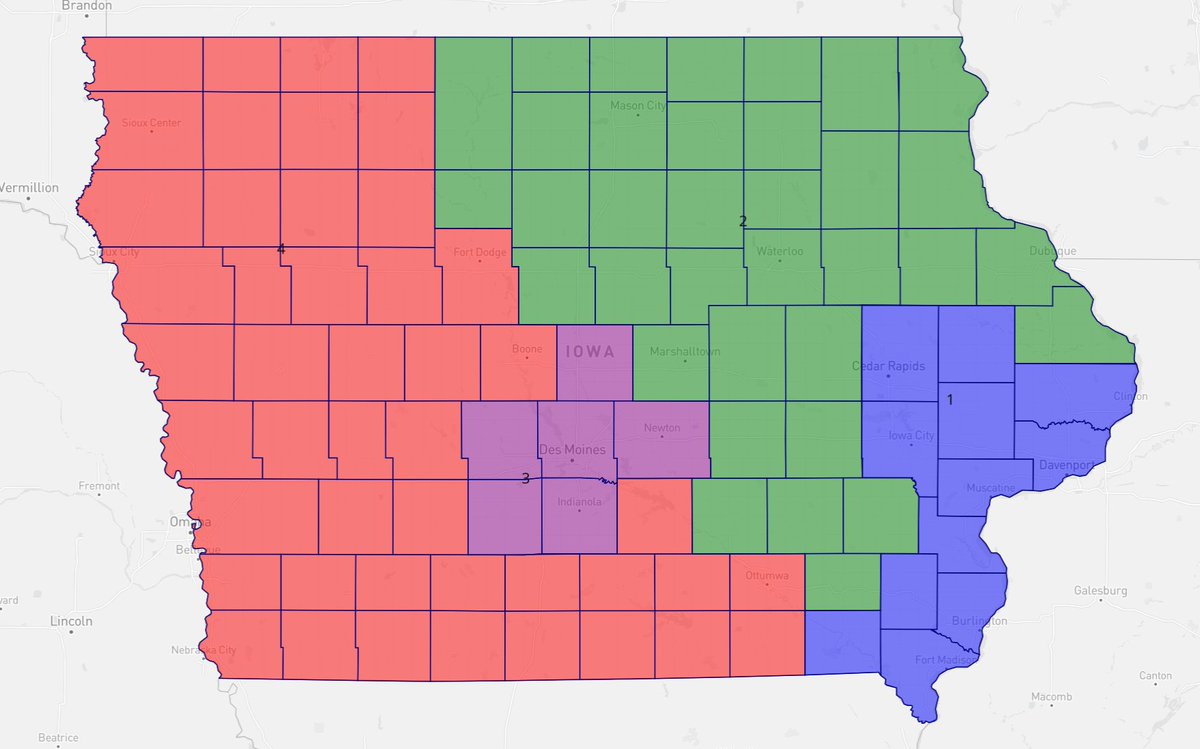 On the other hand, Iowa Republicans would prefer something more similar to the current map, with four Trump districts and zero Biden districts (this hypothetical below has a much larger population variance of 5,478).pic.twitter.com/riUNVAhx7J