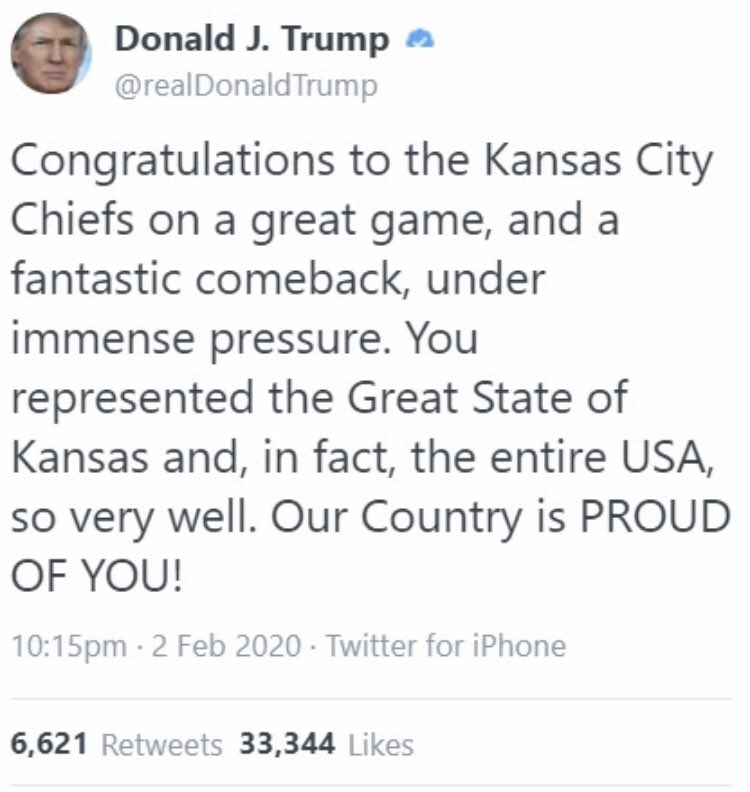 So the Stable Genius who is trump, thinks the KC Chiefs are from the Great State of Kansas. Yeah I have no words for this..