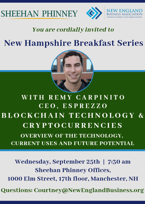 @RemyCarpinito, CEO of@Esprezzoapp and be hosted at the@SheehanPhinney offices in Manchester. Join us to find out more about#blockchaintechnology and#cryptocurrencies.pic.twitter.com/czMipVMqUp