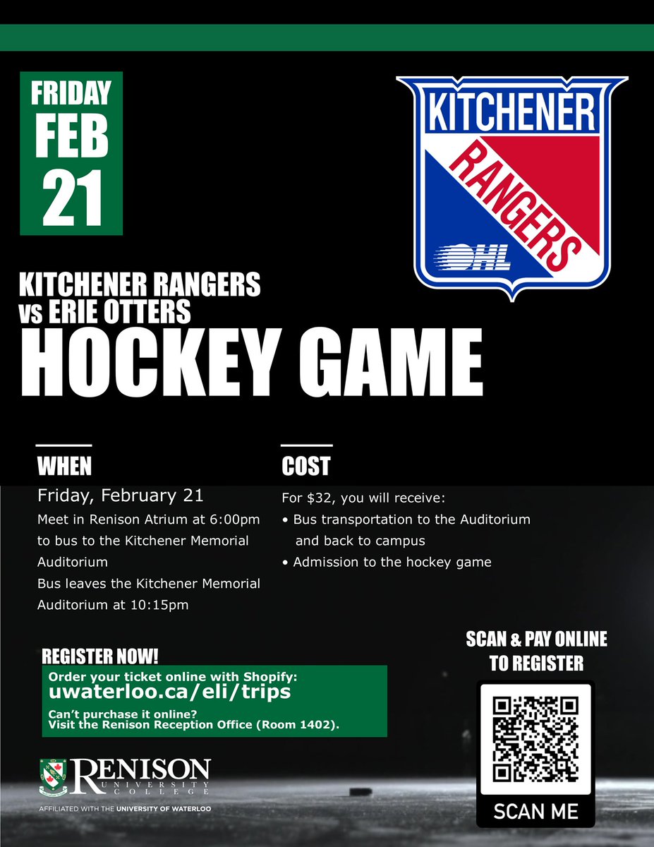 Our #GeneralEnglishAtRenison students went on their own to the@WlooWarriors hockey game at the#Kitchener Memorial Auditorium last night!