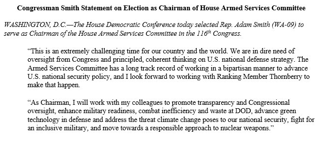 As @HASCDemocrats Chair I'll promote transparency & oversight, enhance readiness, combat inefficiency at DOD, advance green tech & address the threat climate change poses nat'l security, fight for an inclusive military & move towards a responsible approach to nuclear weapons.pic.twitter.com/AnaCLJjZfM