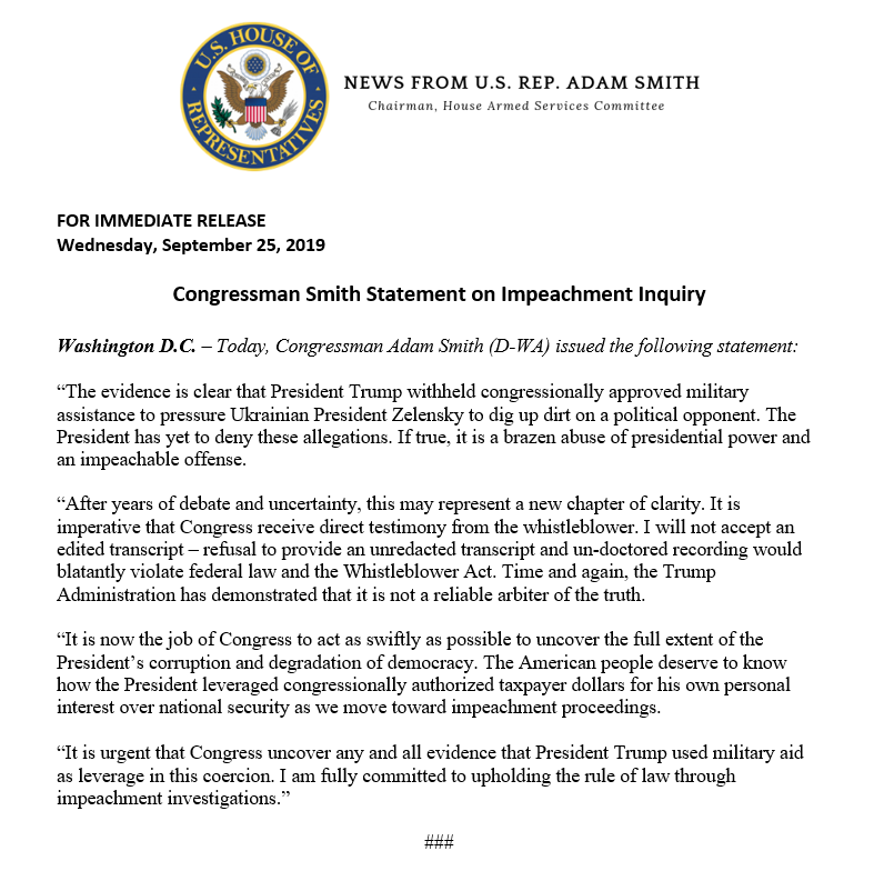 We have reached a point of clarity. The Trump Administration has demonstrated time and again that it is not a reliable arbiter of the truth – we need testimony from the whistleblower and we need a swift impeachment inquiry.